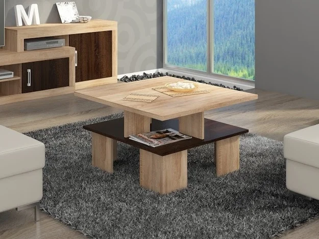 Konferenční stolek TRAFALGAR A v kombinaci světlého dubu sonoma a tmavého dekoru působí stylově a nadčasově. Rozměry 80 × 49 × 80 cm (šířka × výška × hloubka) poskytují dostatek prostoru pro nápoje, ovladače a dekorace.