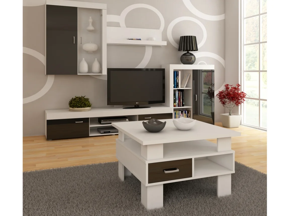 Stylový konferenční stolek USMAT v kombinaci bílé a černého lesku působí elegantně a zároveň poskytuje dostatek místa pro denní potřeby. dvě praktické zásuvky a prostorná horní plocha usnadní ukládání ovladačů, dokumentů i drobností. Konstrukce je vyrobena z LTD desek: boční díly 16 mm a horní deska 25 mm, s ABS hranou 0,6 mm pro vysokou odolnost a snadnou údržbu. Rozměry: 80 cm šířka, 52 cm výška, 80 cm hloubka. Dodává se v demontu. Záruka 5 let zajišťuje dlouhou životnost a spolehlivost.
