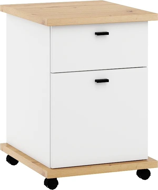 Barva kombinace dub artisan a bílé dodá prostoru svěží a moderní vzhled. Deska je lamino tloušťky 16 mm a 25 mm s ABS hranami pro odolnost a dlouhou životnost. Nohy jsou plastová kolečka o výšce 5 cm, která usnadňují snadné přesuny a flexibilně uspořádají váš prostor. Úchyty jsou černé a dodávají produktu výrazný kontrast. Dodáváno v demontu.