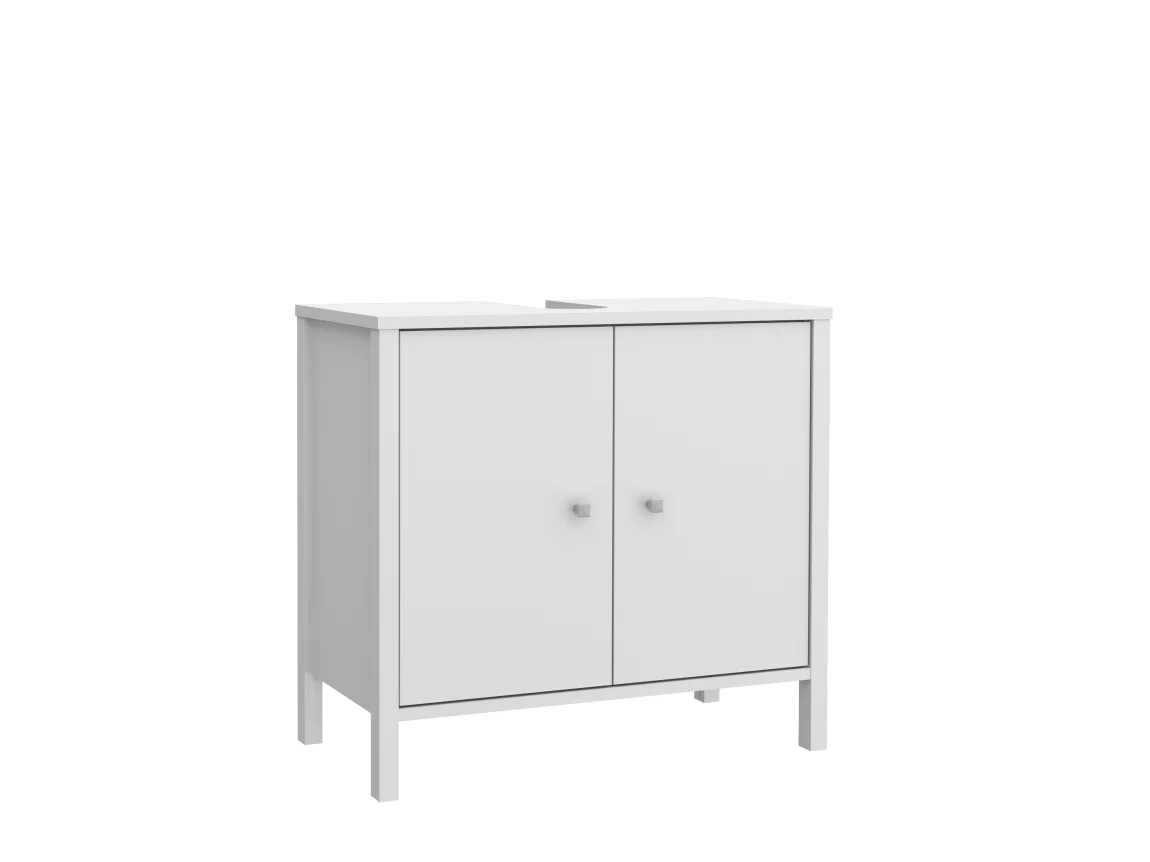 Praktická koupelnová skříňka pod umyvadlo ZOBI nabízí čistý vzhled a efektivní úložný prostor pro drobnosti. Rozměry: 64 × 60 × 34,8 cm (šířka x výška x hloubka). Vyrobena z lamina v bílé barvě; korpus i dvířka jsou bílé a doplňuje ji plastový úchyt.