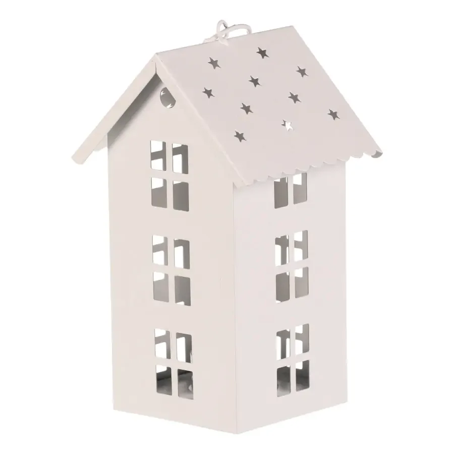 Stylová kovová lucerna LUC324-M ve tvaru patrového domku dodá interiéru romantické kouzlo. Bílá povrchová úprava působí čistě a jemně, zatímco vyřezávaná okénka a hvězdičkové otvory ve střeše jemně propouštějí světlo svíčky. Je možné ji postavit na stůl nebo zavěsit na očko a díky tomu snadno vytvořit kouzelnou atmosféru podle vaší nálady. Díky odolné kovové konstrukci ji lze používat dlouhodobě s klasickou čajovou svíčkou a dodat místnosti teplé, útulné světlo. Tento stylový doplněk se hodí do různých interiérových stylů – od skandinávského minimalismu až po romantický venkov, a vždy dodá prostoru osobitý šmrnc.