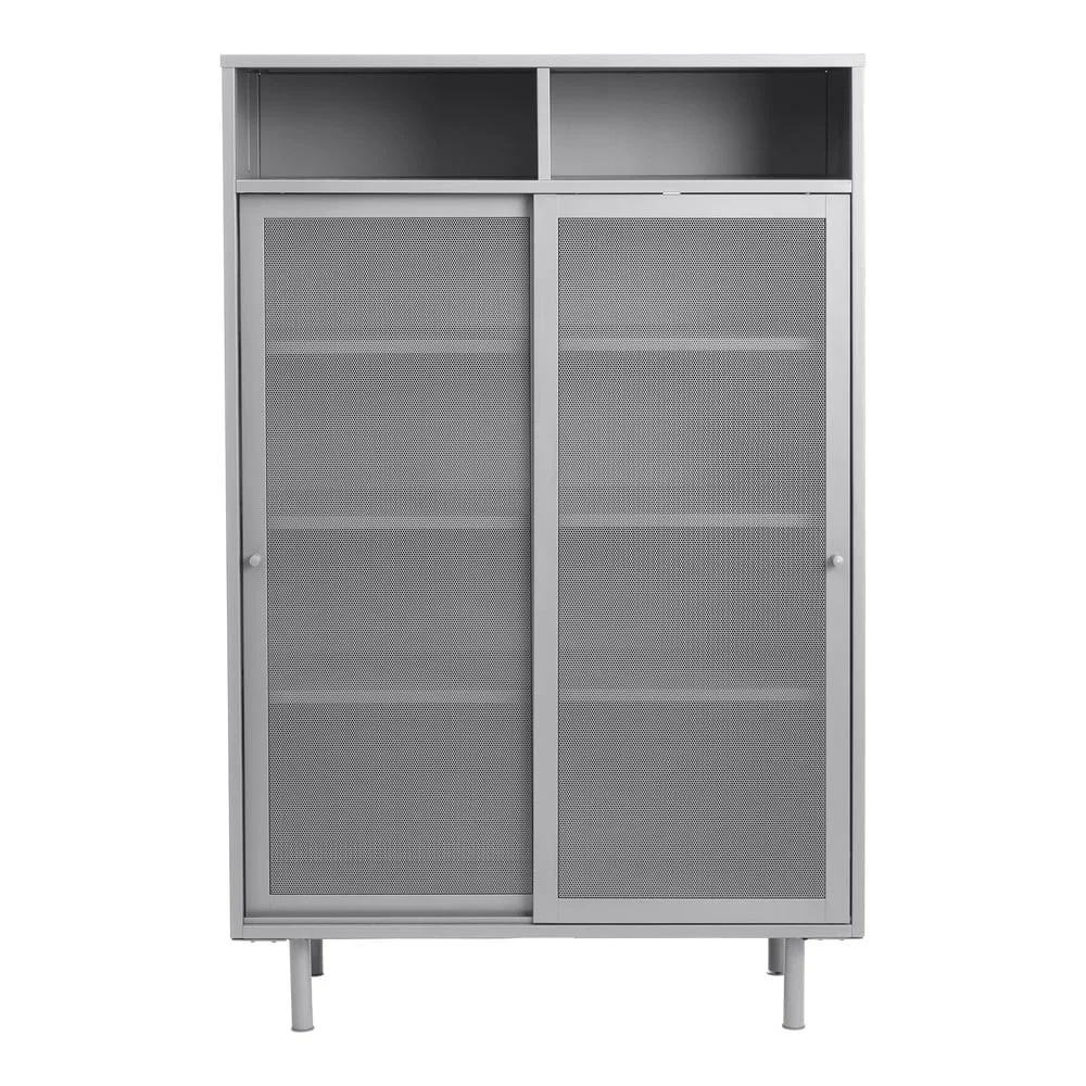 Elegantní šedá kovová skříňka s praktickými posuvnými dveřmi představuje ideální řešení pro úsporu místa a efektivní organizaci. S rozměry 90x140x40 cm nabízí dostatek úložného prostoru a snadné ovládání díky posuvu dveří.