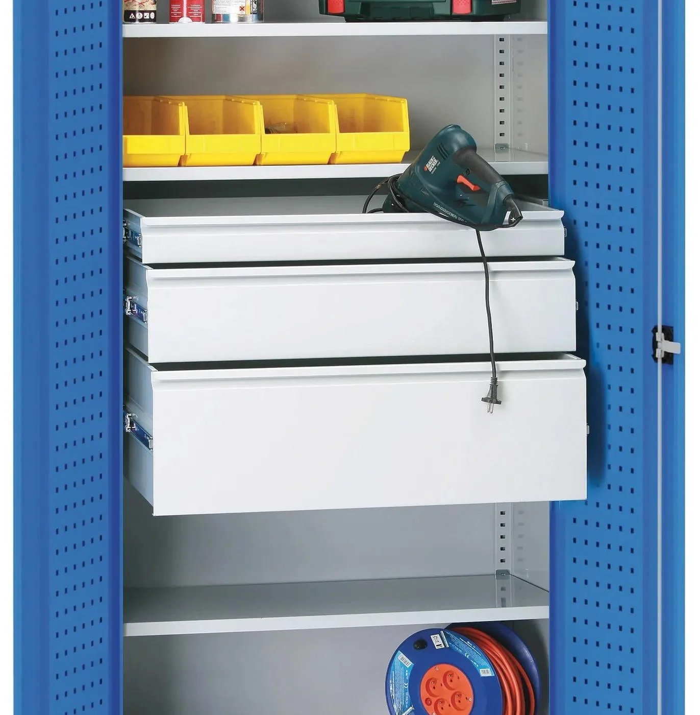 Praktická přídavná zásuvka určená pro kovové skříně s katalogovým číslem 178754, která rozšíří úložný prostor ve vašem pracovním nebo skladovacím prostředí. Tato zásuvka je opatřena odolnou povrchovou úpravou práškovým lakem v elegantní šedé barvě RAL 7035, což zajišťuje její dlouhou životnost a snadnou údržbu. Vyrobená je z pevného plechu o tloušťce 0,7 mm a je schopná unést až 40 kg nákladu. Díky moderním kuličkovým pojezdům s plným vysunutím do 100 % hloubky je manipulace s uloženým materiálem velmi komfortní. Tento produkt je ideální volbou pro efektivní organizaci a zvýšení funkčnosti vašich kovových skříní, přičemž doporučujeme kalkulovat s jednou přidanou policí navíc, zvláště pokud je nad zásuvkou umístěna vrchní police.