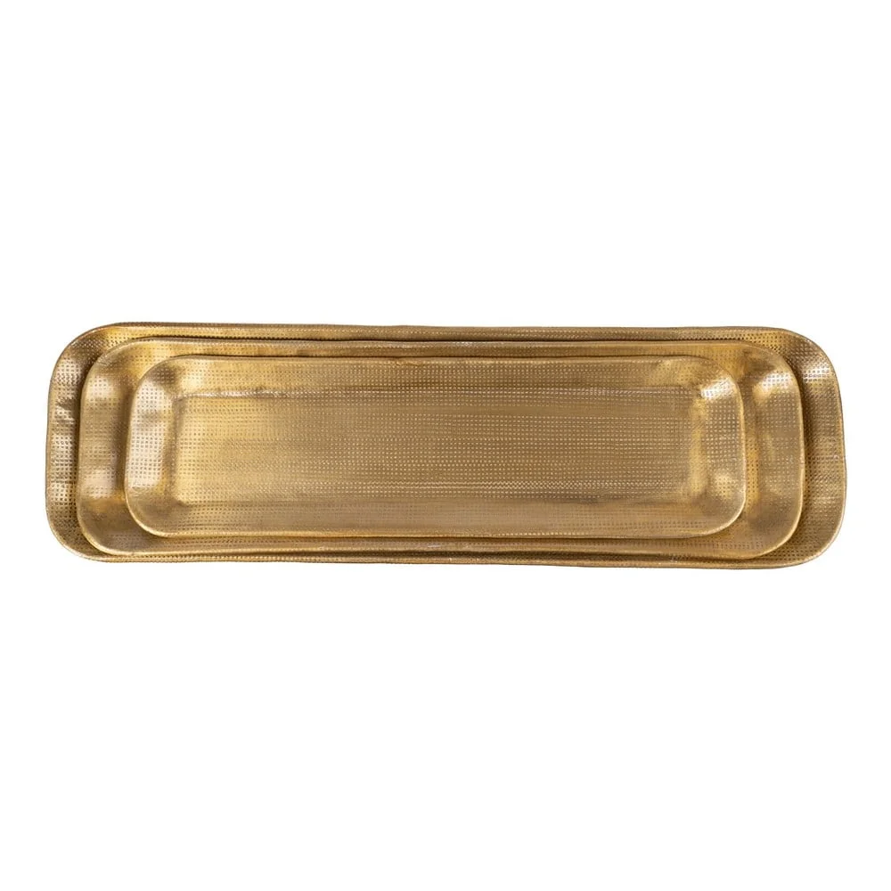 Elegantní sada tří kovových táců Grau od značky Ixia je ideální volbou pro zvýraznění stylu vašeho domova. Tyto praktické a designové podnosy skvěle poslouží jak při servírování nápojů či jídel, tak i jako dekorativní doplněk pro vystavení vašich oblíbených dekorací. Díky jejich zlatavému povrchu působí luxusně a dodají vašemu prostoru nádech sofistikovanosti. Navíc jsou velmi odolné a snadno udržovatelné, což je činí ideální volbou do moderních i tradičních interiérů. Vyberte si správnou velikost z rozměrů 37,5 x 11,4 cm, 43,8 x 12,7 cm nebo 48,3 x 14 cm a využijte jejich všestrannost naplno.