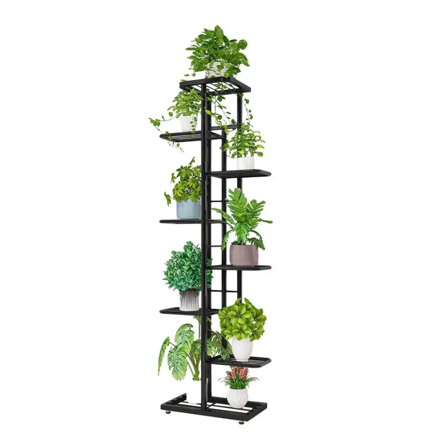 Elegantní kovový stojan na květiny BAMIR TYP 4 v tmavě šedé barvě nabízí 8 polic, na kterých pohodlně umístíte až 9 květin. Konstrukce je vyrobena z pevného kovu a stojí stabilně na nožkách s rektifikačními šrouby pro vyrovnání nerovností podlahy. Každá police unese až 2 kg a rám má tloušťku tyče 1,6 cm, což zajišťuje dlouhou životnost. Police jsou různě výškově uspořádány, aby zvládly různě vysoké nádoby a dekorace. Stojan se dodává demontovaný, což usnadňuje dopravu a následnou montáž doma.