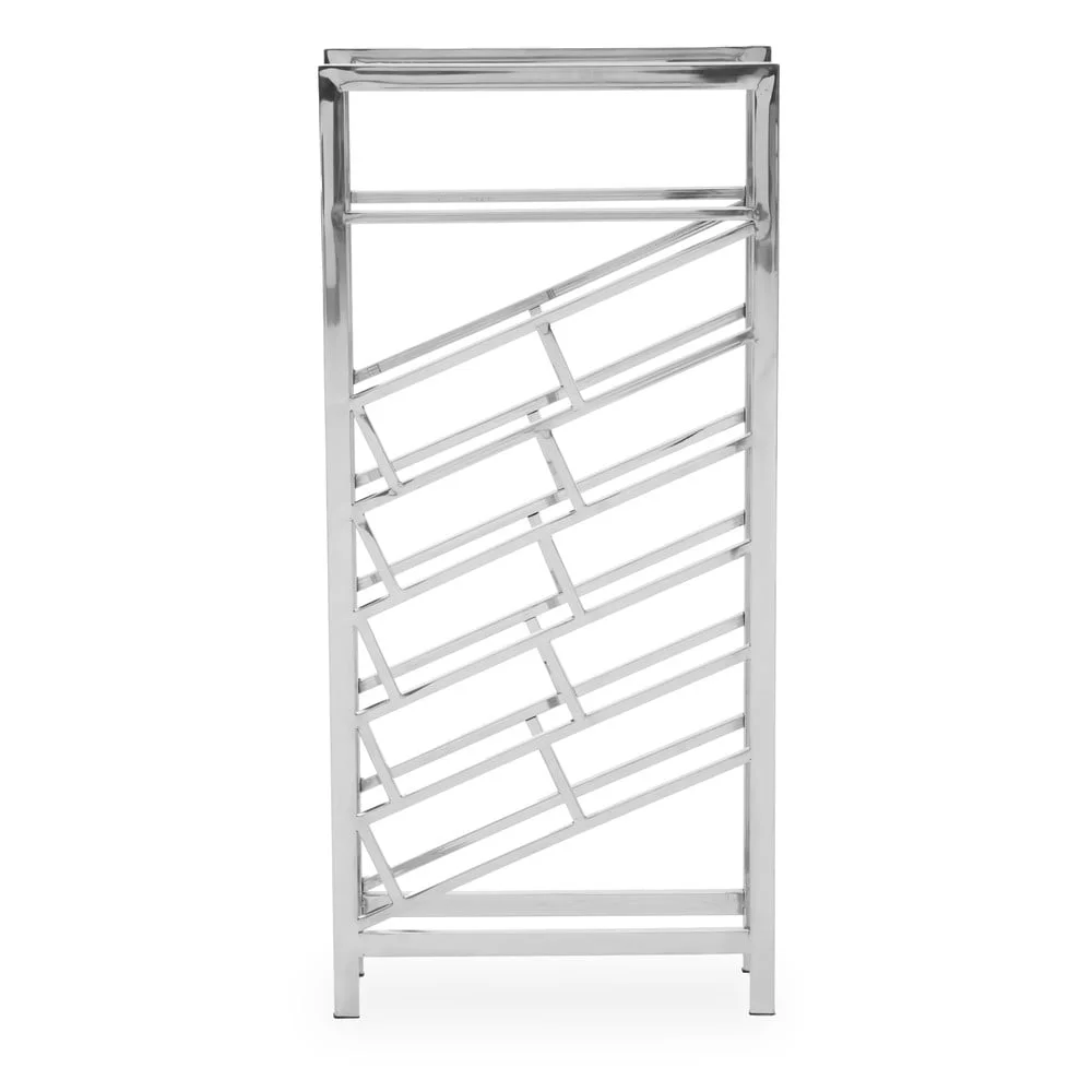 Elegantní kovový regál na víno v lesklém stříbrném provedení je ideálním doplňkem pro všechny milovníky vína. Tento praktický stojan pojme až 24 lahví, což vám umožní mít vaše oblíbené lahve vždy přehledně uspořádané.