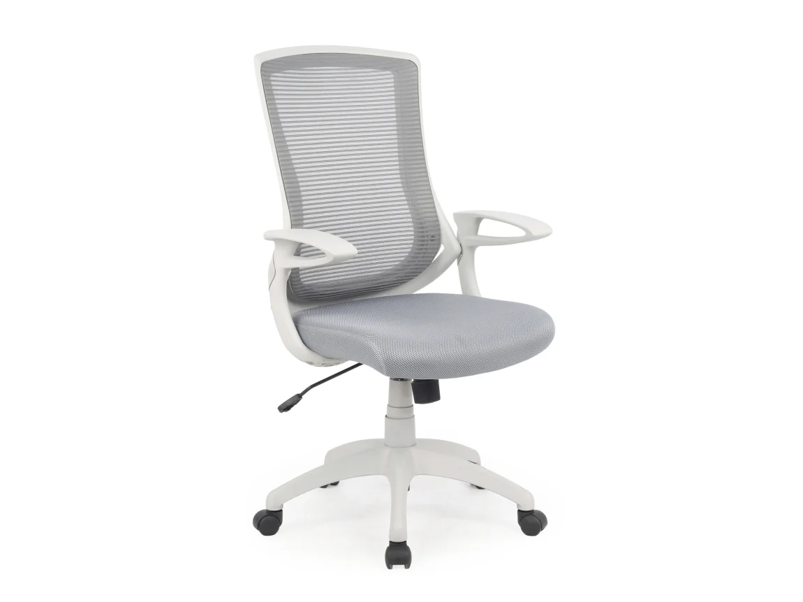 Kancelářské křeslo BOTIA v šedém provedení kombinuje látku a síťovinu pro lepší prodyšnost a komfort během pracovního dne. Rozměry 66 cm šířky, 63 cm hloubky a 104–114 cm výšky, s výškou sedu 45–55 cm, vyhovují různým výškovým potřebám stolu.