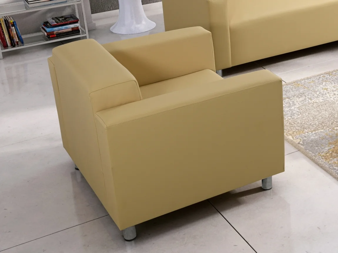 Křeslo Gideon 3 působí svěže a stylově díky provedení krémová ekokůže. Potah je vyroben z látky Madryt 111, která evokuje vzhled kůže a zároveň nabízí snadnou údržbu. Srdcem pohodlí je systém vlnitých pružin a polyuretanová pěna T25, jenž zajišťuje vyvážené sezení na dlouhé roky.