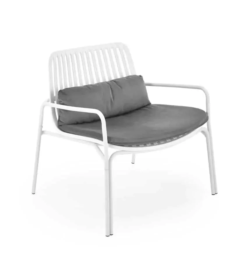 Odolný bílý kovový rám dodává křeslu stabilitu a dlouhou životnost i při venkovních podmínkách. Čalounění z měkké šedé látky zajišťuje příjemný povrch pro sezení. Sedák z polypropylenu je jednoduchý na údržbu a odolný vůči vlhkosti, UV záření a povětrnostním vlivům. Pro kompletní vzhled stačí vybrat odpovídající zahradní stůl z naší nabídky. Křeslo se dodává demontované, nicméně jeho sestavení je rychlé a jednoduché.