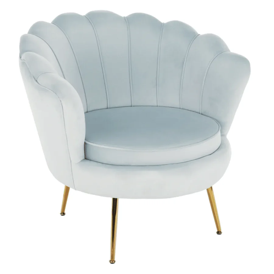 Elegantní křeslo v glamour stylu ve tvaru mušle se hodí do obývacího pokoje, ložnice či pracovny. Je potažené šedomodrou sametovou látkou Velvet, která dodává nábytku jemný lesk a luxusní dojem sametová látka Velvet.