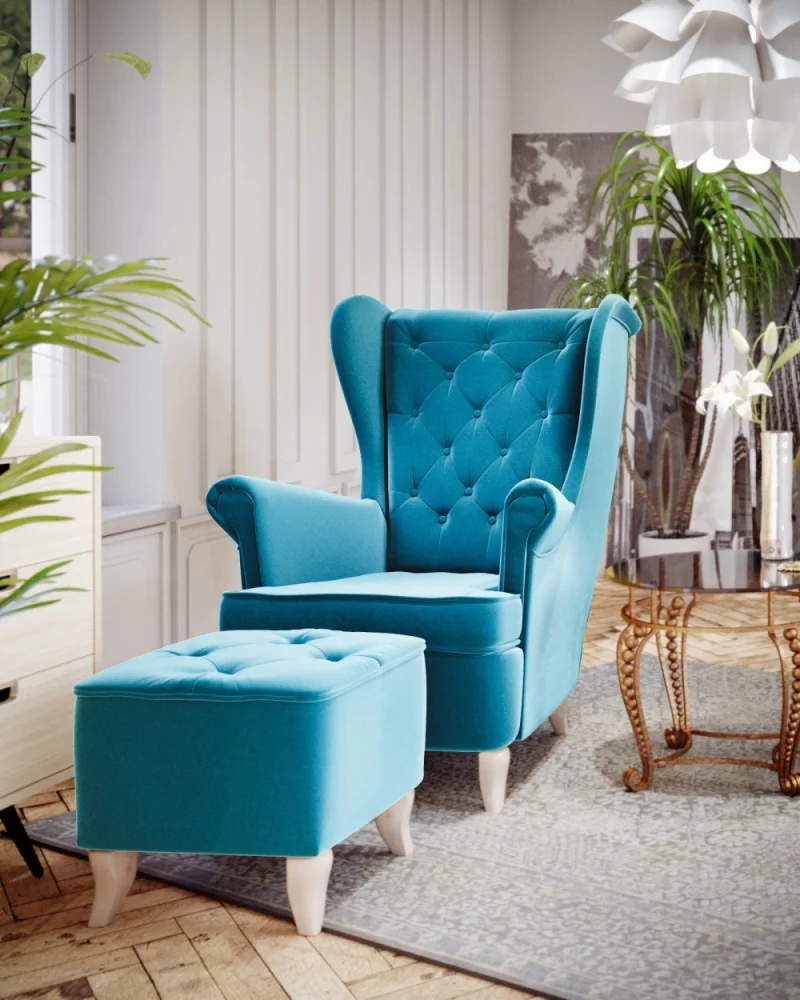 Pohodlné křeslo se prodává samostatně a taburet tedy není součástí ceny. Provedení: látka Cosmic 05 - modrá dodává křeslu příjemný vzhled a vysokou odolnost. Rozměry: šířka 70 cm, výška 105 cm a hloubka 63 cm; sedací plocha 43 × 58 cm.