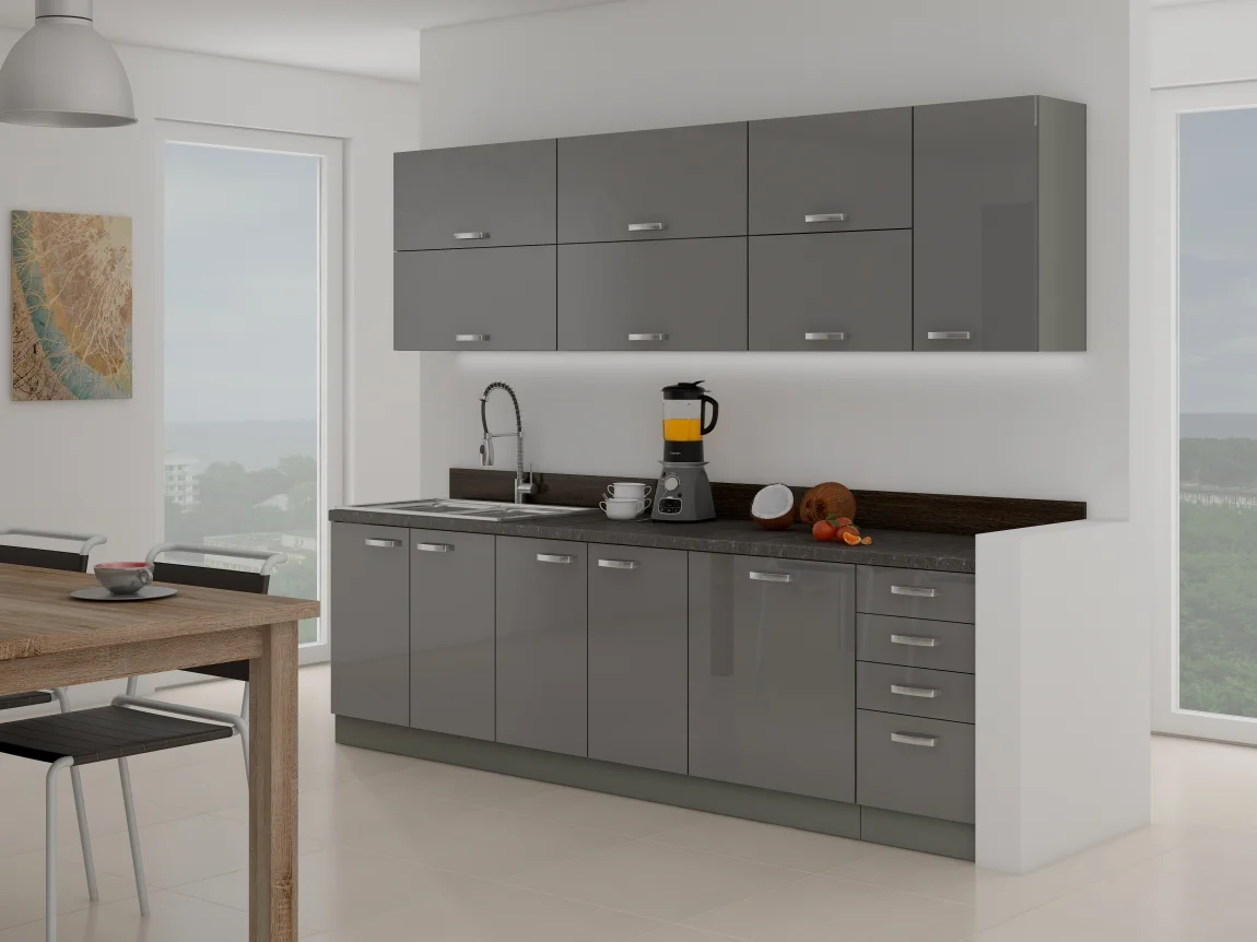Kuchyně AVERNA 260 cm – korpus platinově šedý, dvířka šedý lesk Kuchyně