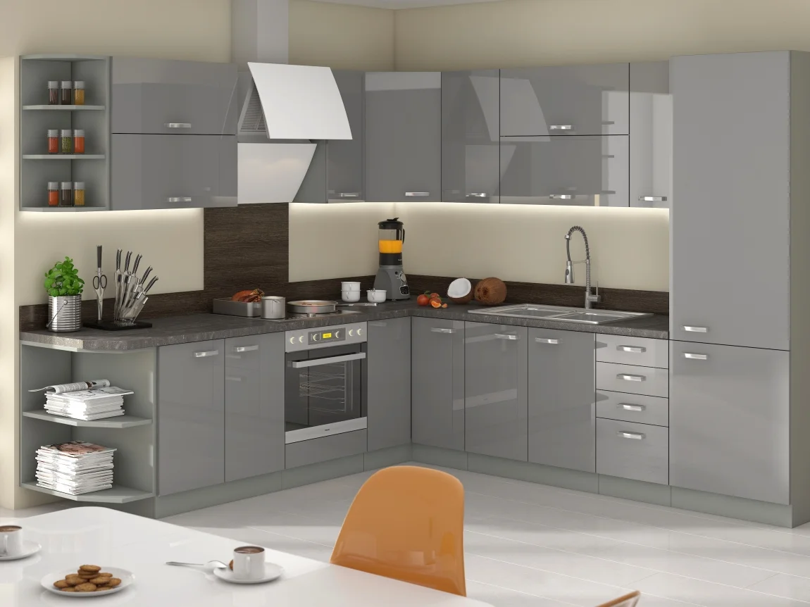 V nabídce najdete široký výběr rozměrů spodních i horních korpusů, které lze kombinovat pro ideální uspořádání vaší kuchyně. Skříňky disponují tichým dovíráním dvířek a zásuvek; pracovní deska není součástí a úchytky lze namontovat horizontálně či vertikálně. Barva korpusu je platinově šedá a dvířka mají šedý lesk; úchyty pak v kovově lesklé podobě. Materiály zahrnují lamino a HDF, s ABS hranami na dvířkách a kovovým úchytem; dodáváno v demontu. Díky členění na jednotlivé díly si snadno navolíte rozvržení a zefektivníte skladování, což usnadní každodenní přípravu jídla.