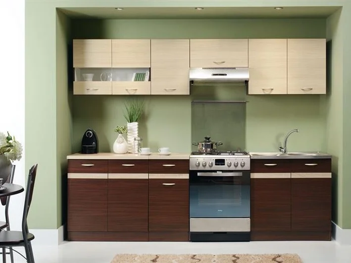 Elegantní kuchyně BELISA v délce 200/260 cm kombinuje odolný LTD materiál s čistou kombinací dekorů: korpus dub wenge, horní dvířka rijeka světlá a dolní dvířka v dekoru dub wenge se světlým páskem rijeka světlá.