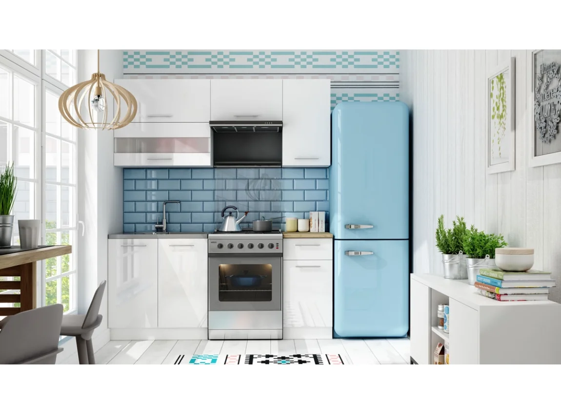 Korpus je vyroben z lamina o tloušťce 16 mm s ABS hranou 0,5 mm; pracovní desky dolních skříněk jsou 28 mm silné a vnitřní poličky z lamina 16 mm. Přední plochy dvířek a zásuvek tvoří MDF 16 mm potažené PVC folií; závěsy 35 mm jsou regulovatelné ve třech osách a úchytky kovové. Nohy jsou plastové a výškově nastavitelně; systém tichého dovírání dveří a zásuvek zajišťuje jemné uzavírání. Temperované sklo zdobí přední plochy; součástí jsou sokly a pracovní deska šířky 40 cm. V ceně není dřez ani spotřebiče a dodává se v demontu; záruka činí 24 měsíců. Díky lesklému provedení působí prostor svěže a opticky zvětšuje kuchyni, zatímco údržba je snadná. Skvělá volba pro moderní domácnost, která chce styl i praktičnost v jednom.