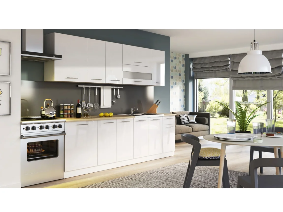 Korpus je z lamina 16 mm s ABS hranou 0,5 mm; pracovní desky spodních skříněk mají tloušťku 28 mm a vnitřní police 16 mm lamina. Přední plochy dvířek a zásuvek jsou MDF 16 mm potaženy PVC folií, závěsy 35 mm jsou regulovatelné ve třech osách a úchytky kovové; nohy jsou plastové a výškově nastavitelné. Součástí sestavy jsou sokly a dělená pracovní deska v šířkách 40, 60 a 80 cm. V ceně linky není dřez ani spotřebiče a dodává se v demontu; záruka činí 24 měsíců. Tiché dovírání dveří a zásuvek zajišťuje klidný chod ve vaší kuchyni.