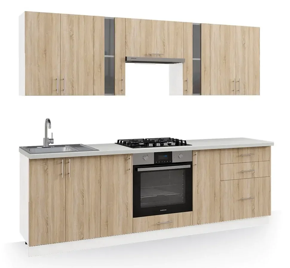 Moderní kuchyně FELIPE B 240 spojuje praktické řešení s čistým designem a umožňuje flexibilní uspořádání podle prostoru. Modulární systém umožňuje libovolně kombinovat spodní i vrchní skříňky; korpus a sokl jsou bílé a dvířka v odstínu dub sonoma dodají kuchyni teplý, přirozený vzhled. Úchyty jsou stříbrné plastové a jemně dotvářejí moderní dojem. Sestava zahrnuje spodní skříňky: výška 82 cm (s pracovní deskou 85 cm) a hloubka 47 cm, vrchní skříňky výška 72 cm a hloubka 32 cm (nad digestoří 36 cm); v nabídce jsou 60 cm i 30 cm díly a prostor pro vestavěnou troubu. Kuchyně se prodává jako kompletní sestava a není možné dokupovat další skříňky; lze však doplnit dřez nebo pracovní desku. Dodáváme v demontovaném stavu, připravenou k montáži. Tato kombinace bílé a dřevěného sonoma působí svěže a hodí se do moderních i tradičně laděných interiérů.