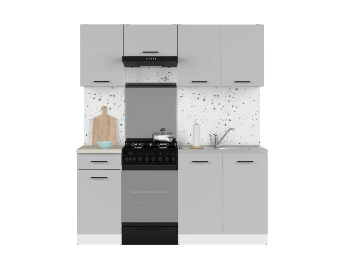 Kuchyně JAMISON nabízí rozměry 120 cm spodní řady a 170 cm horní řady se stylovým provedením světle šedého lesku na dvířkách a bílým korpusem. Materiál LTD zaručuje snadnou údržbu a odolnost vůči vlhkosti, což oceníte při každodenním používání.