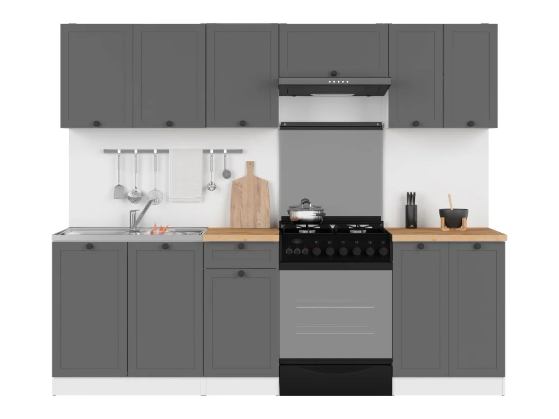 Tato modulární kuchyně JAMISON nabízí délku 180/240 cm bez pracovní desky, takže máte volnost vybrat si vlastní desku a doplňky. Korpus je v bílé barvě, dvířka jsou grafitová a materiál LTD zaručuje nízkou údržbu a dlouhou životnost. Délka dolní řady činí 180 cm a horní řady 240 cm. Dolní skříňky zahrnují 80 cm dřezovou (bez dřezu a desky), 40 cm jednodveřovou se šuplíkem a vnitřní policií a 60 cm dvoudveřovou; horní skříňky pak 80 cm dvoudveřové, 60 cm nad digestoř dvoudveřové, 60 cm dvoudveřové a 40 cm jednodveřové. Výšky: dolní skříňky 82 cm, horní 57,5 cm; hloubky: dolní 47 cm, horní 30,5 cm. Pod dřezovou skříňku můžete osadit celoplošný dřez 80x60 cm. Dřez, spotřebiče a dekorace nejsou součástí ceny. Dodáváno v demontu.