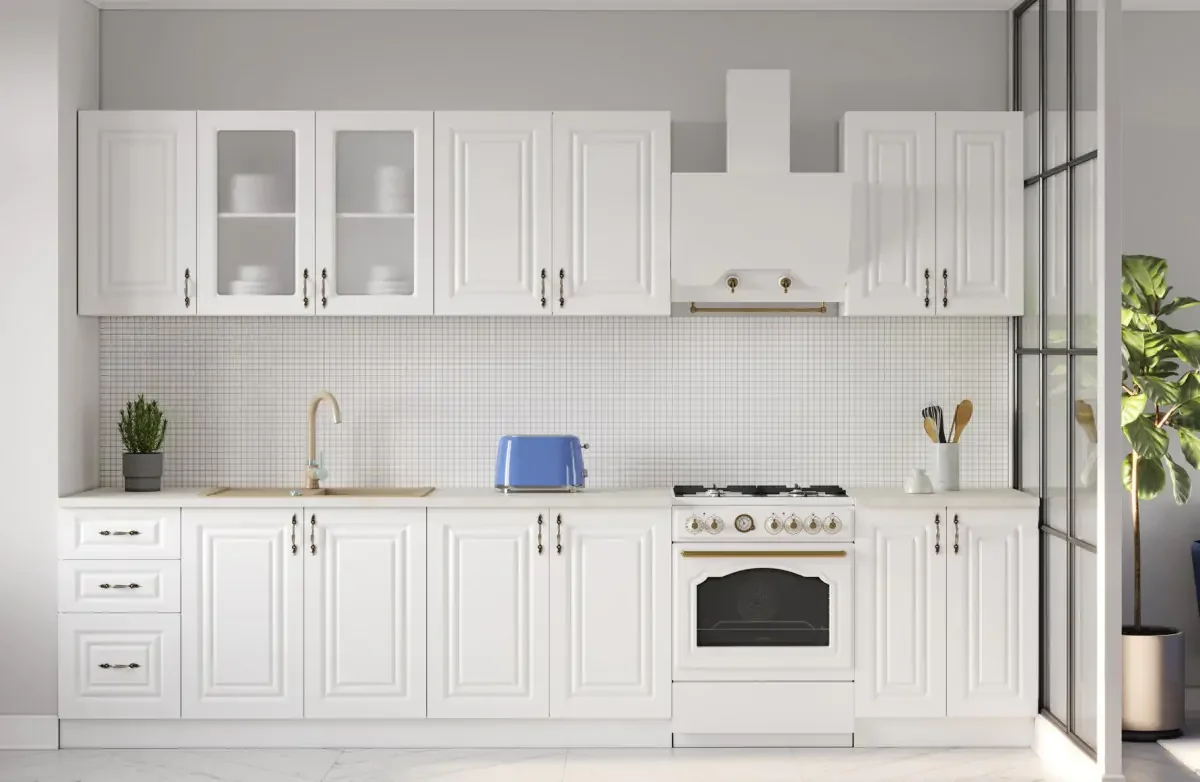 Korpus a sokl jsou z kvalitní LTD desky v bílé strukturální barvě, dvířka mají bílé supermat povrch a úchyty jsou bronzové, což dodává prostoru jemný kontrast. Modulární systém umožňuje snadnou úpravu a budoucí rozšíření, třeba dokoupit dřez nebo pracovní desku. Poznámka: pracovní deska, spotřebiče, dřez a digestoř nejsou součástí sestavy. Složení zahrnuje spodní skříňky a vrchní skříňky v různých šířkách (40/60/80 cm) s odpovídajícími výškami a hloubkami, aby vznikla plná kuchyně na míru. Kuchyně se prodává jako kompletní sestava a není možné dokoupit samostatné skříňky. Dodáváme v demontovaném stavu.