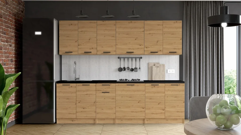 Kuchyně MALLEM o celkové délce 260 cm nabízí dolní a horní řadu v jednotném vzhledu s artisan povrchovou úpravou. Je vyrobena z lamina tloušťky 16 mm, což zaručuje stabilitu a snadnou údržbu. Korpus i dvířka mají artisan provedení a doplňují je černé úchyty pro moderní vzhled. Dolní část sestavy zahrnuje skříňky s výškou 82 cm, hloubkou 47 cm a šířkami 80 cm, doplněné dřezovou skříňkou a moduly šířek 40, 60 a 80 cm. Horní řada je vysoká 72 cm, hluboká 32 cm a rovněž nabízí šířkové bloky 40, 60 a 80 cm. Dřez, spotřebiče a pracovní deska nejsou součástí ceny. Dodáváno v demontu. S touto sestavou lze variabilně uspořádat kuchyni podle prostoru a preferencí, což z ní dělá praktické i stylové řešení pro každou domácnost.