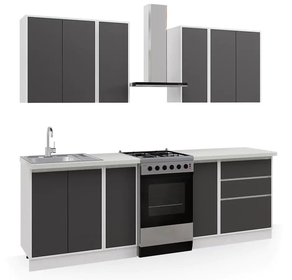 Moderní Kuchyně NUEVA A 180 spojuje praktičnost s čistým designem, který se hodí do každé moderní domácnosti. Korpus a sokl jsou vyrobeny z kvalitní LTD desky v bílé barvě, dvířka v odstínu antracit a bezúchytový systém otvírání dodávají prostoru elegantní vzhled. Díky modulární konstrukci si můžete skříňky poskládat v libovolném pořadí a vytvořit kuchyni podle svých představ. Součástí sestavy jsou spodní skříňky (výška 82 cm, hloubka 47 cm; s pracovní deskou 85 cm vysoká, hloubka 60 cm) a horní skříňky (výška 72 cm, hloubka 32 cm). Rozměry a uspořádání zahrnují: 60 cm skříňka pod dřez (2 dveře), 60 cm skříňka se 3 zásuvkami, 2× 30 cm skříňky s 1 dveřmi a pro horní část 2× 60 cm skříňky 2-dveřové a 2× 30 cm skříňky 1-dveřové. Kuchyně se prodává jako kompletní sestava a není možné dokupovat jednotlivé skříňky; lze však dokoupit dřez a pracovní desku. Dodáváme v demontovaném stavu.