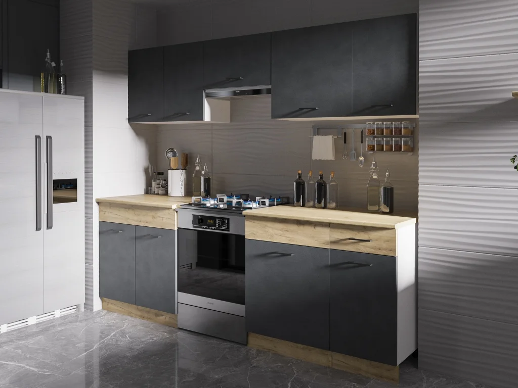 Kuchyně PIETRUS o délce 180/240 cm nabízí praktické uspořádání se spodní řadou 180 cm a horní řadou 240 cm pro pohodlné vaření a dostatek úložného prostoru. Korpus je bílý a dvířka tvoří kontrastní kombinaci antracit/dub craft, která dodává moderní a nadčasový vzhled.