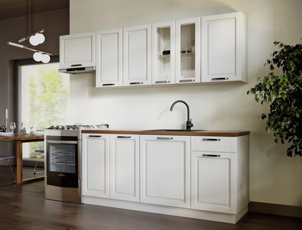 Modulární kuchyně SNOW nabízí sestavu s celkovou šířkou 180/240 cm s možností doplnění dalších skříněk podle vašich představ. Korpus je provedený v bílé barvě a dvířka jsou z bílé MDF, což působí čistě a svěže.