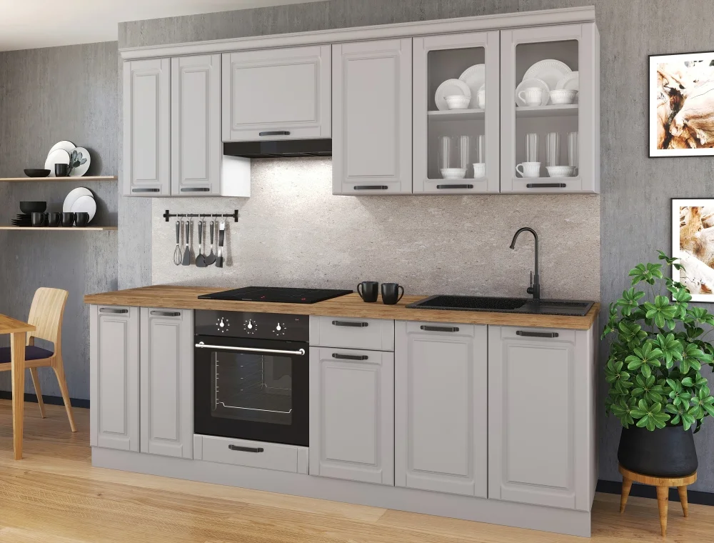 Modulární kuchyně SNOW o šířce 240 cm nabízí variabilní sestavu, kterou lze doplnit o další skříňky či plně přizpůsobit prostoru. Korpus je proveden v bílé barvě a dvířka z MDF lakované šedou barvou, čímž vzniká moderní kontrast.