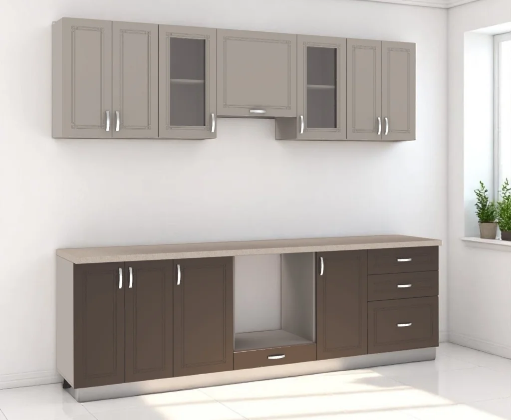 Elegantní kuchyňská sestava SOLLON o celkové délce 260 cm na dolní i horní řadě vám poskytne moderní a praktické řešení. Korpus v kašmírové barvě doplňuje horní dvířka latte lesk a spodní dvířka irish lesk, čímž vzniká svěží kontrast.