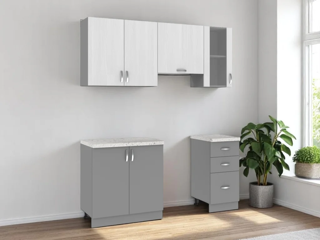 16 mm lamino s kovovými úchyty a matným sklem satin vytváří moderní, snadno udržovatelný vzhled. Rozmístění jednotlivých skříní: dolní řada má výšku 82 cm, hloubku 47 cm a šířky 80 cm; k dispozici je dřezová skříňka KH-14 40 cm a skříňka se 3 zásuvkami KH-19. Horní řada má výšku 72 cm, hloubku 32 cm a šířky 80 cm; obsahuje horní skříňky K7-12 60 cm, K7-27 s výklopnými dvířky a plynovými písty (výška 57 cm) a prosklenou skříňku K7-8. Dřez, spotřebiče a pracovní deska nejsou součástí ceny; dodáváno v demontu. Pro moderní interiéry je tato sestava praktickým řešením s výrazným kontrastem dvou barev a snadnou údržbou.