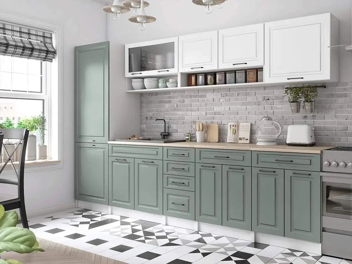 Kuchyňská linka Brigita 300 v provedení bílé a světlé zelené MAT povrchu přináší do kuchyně příjemný venkovský nádech a zároveň praktický charakter, ať už bydlíte v paneláku nebo v rodinném domě. Tento vzhled spojuje útulnost s funkčností a poskytuje dostatek úložného prostoru i pracovní plochy; jednotlivé skříňky jsou samostatné, takže si je můžete uspořádat podle prostoru. Korpusy skříněk jsou vyrobené z 18 mm lamina s ABS hranami, dvířka z MDF 16 mm, dodáváme je v demontu spolu s montážním plánem a potřebným spojovacím materiálem. Cena uvedená na fotografii platí pro sestavu BEZ pracovní desky a BEZ doplňků, které jsou zobrazené na doplňkových fotografiích; pracovní desku lze dokoupit podle šířky jednotlivých skříněk. Spotřebiče, dřez, baterie ani dekorace nejsou součástí ceny. Sada je dodána s bílými korpusy a dvířky v bílé a světlé zelené MAT úpravě. Rozměry horních skříněk: skříňka s výklopnými prosklenými dvířky š80 cm, výška 58 cm, hloubka 30 cm; skříňka s výklopnými prosklenými dvířky š100 cm, výška 58 cm, hloubka 30 cm; skříňka š60 cm, výška 58 cm, hloubka 30 cm. Rozměry spodních skříněk: potravinová skříň š60 cm, výška 201 cm, hloubka 55 cm; dřezová skříňka š80 cm, výška 83 cm, hloubka 45 cm; skříňka se zásuvkami š40 cm, výška 83 cm, hloubka 45 cm; 2× skříňka se zásuvkou š60 cm, výška 83 cm, hloubka 45 cm.