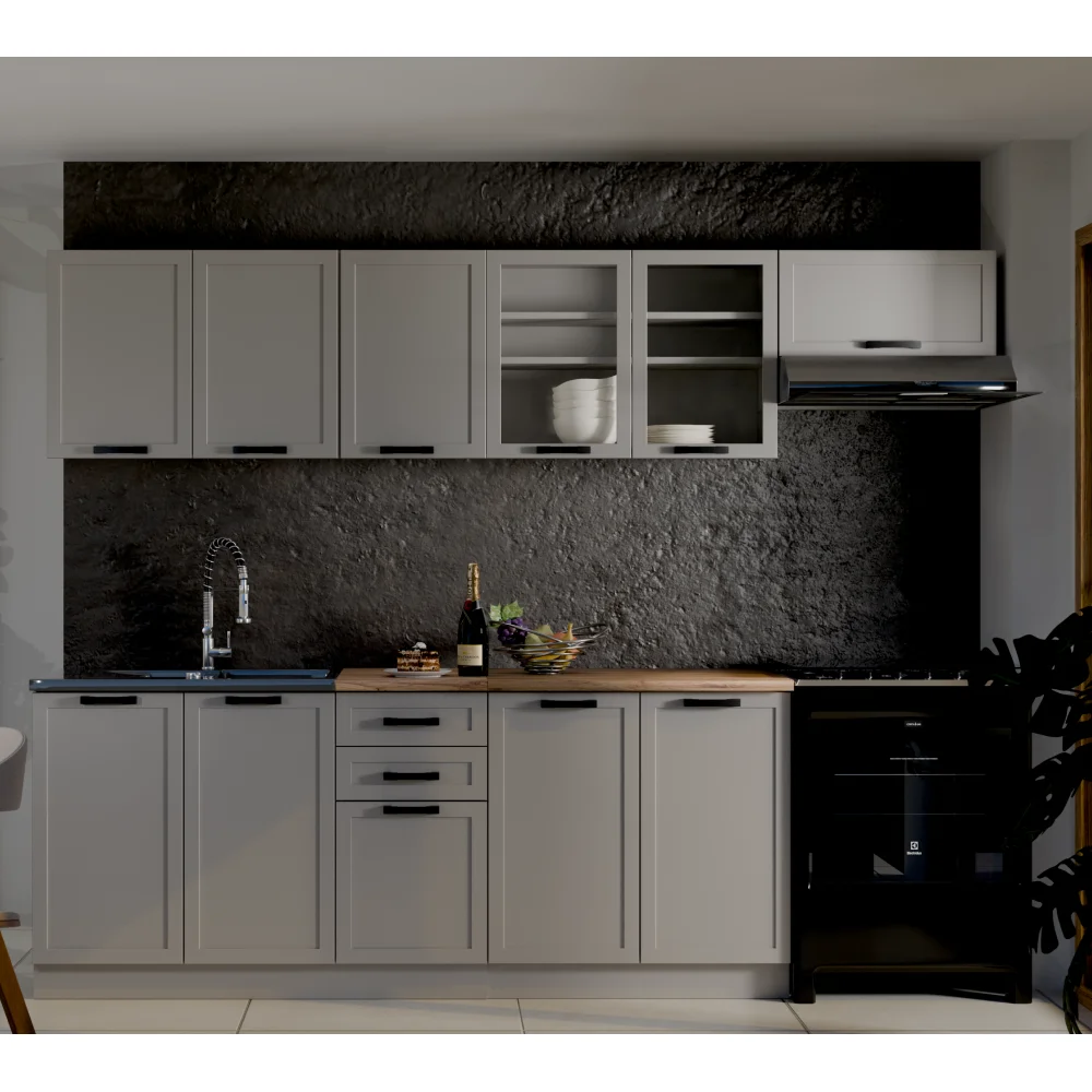 Kuchyňská linka ELGIA v provedení kašmír s dekorem dub Wotan kombinuje odolný laminovaný povrch DTD/MDF s atraktivním vzhledem a dlouhou životností. Celková délka horní části činí 2,6 m a spodní část má šířku 2 m, přičemž tloušťka korpusu dosahuje 1,6 cm. Vybavení zahrnuje horní skříňky G80 (80x29x58 cm), G40-P (40x29x58 cm), G80W (80x29x58 cm) a G60-OK (60x29x40,5 cm) a spodními skříňkami D80ZL (80x45x82 cm), D40SZ (40x45x82 cm) a D80 (80x45x82 cm). Pracovní deska o tloušťce 2,8 cm je dodávána ve dvou částech v dekoru dub Wotan a její rozměry jsou 80x60x2,8 cm a 40x60x2,8 cm. Deska se dodává bez dřezu, ale lze ji doplnit o vybraný model z naší nabídky a otvor pro dřez je nutné vypilovat. Součástí balení je spodní a boční sokl/lišta spolu s úchyty z plastu v černé barvě; dekorace a spotřebiče nejsou součástí balení a linka přijíždí demontovaná. Pro snadnou úpravu prostoru je linka modulární a umožňuje flexibilní uspořádání skříněk; kombinace světlého kašmíru a teplého dubu Wotan vytváří nadčasový vzhled vhodný pro moderní i tradiční kuchyně.