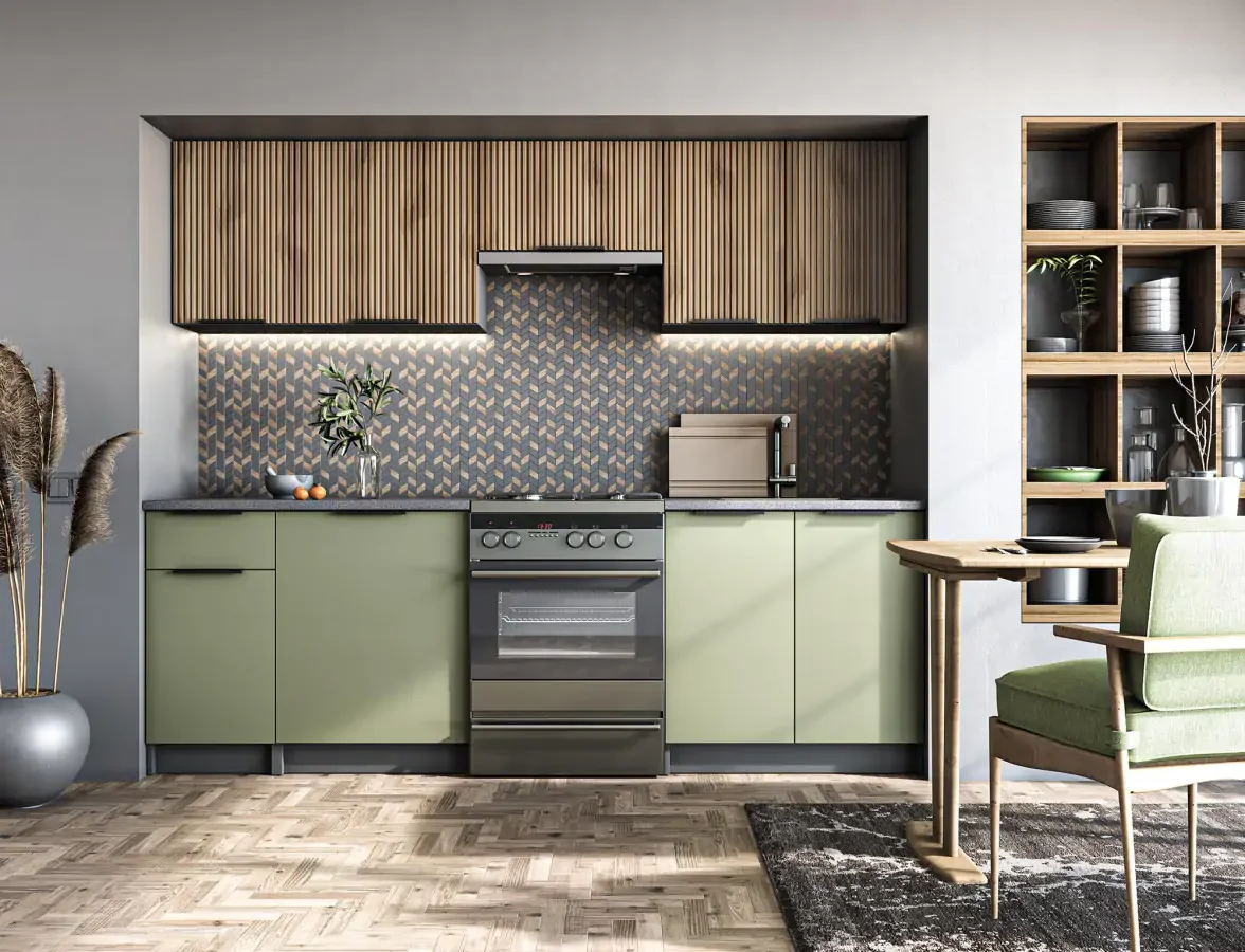 Kuchyňská linka KSENIA 240 kombinuje praktické řešení s moderním vzhledem a stane se středobodem vaší kuchyně. Spodní dvířka v pistáciové barvě vnášejí do prostoru svěžest a lehkost, zatímco úchytky fungují jako stylový akcent. Horní dveře z drážkové desky v odstínu ořechu dodávají teplo a vytvářejí příjemný kontrast se světlým předním panelem a tmavým korpusem. Čela horních skříněk jsou z MDF a dveře jsou osazeny plynovými zvedáky pro pohodlné otevírání. Pracovní deska o tloušťce 28 mm působí stabilně a dodává kuchyni kvalitní dojem. Barvy sestavy: přední strany světlý ořech a pistácie, korpus antracit, top šedá; dodávaná v demontu. Díky kombinaci materiálů a provedení získáte odolný a snadno udržovatelný úložný prostor pro každodenní vaření. Objevte radost z vaření v prostředí, které splní vaše estetické i funkční nároky.