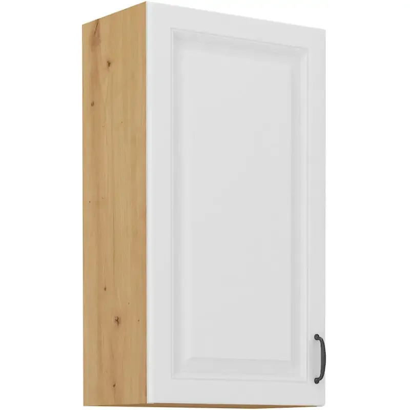 Kuchyňská horní skříňka Falco Stipe kombinuje lamino 16 mm v bílé barvě s korpusem v dekoru dub artisan, čímž vzniká elegantní kombinace pro moderní prostor. Vnitřní část je bílá, dvířka mají černý kovový úchyt o délce 124 mm a jsou vybavena systémem tichého dovírání, přičemž montáž lze provést s pravým i levým otevíráním dveří. Uvnitř se nacházejí tři police, které poskytují dostatek místa pro nádobí a potraviny a zároveň zajišťují přehledné uskladnění. Skříňka se dodává demontovaná a součástí je montážní plán spolu se veškerým spojovacím materiálem; rozměry jsou 45 cm (š) × 90 cm (v) × 31 cm (h). Díky modulární povaze snadno doplníte další skříňky a dosáhnete tak jednotného, stylového vzhledu vaší kuchyně, který lze snadno rozšířit podle potřeby.