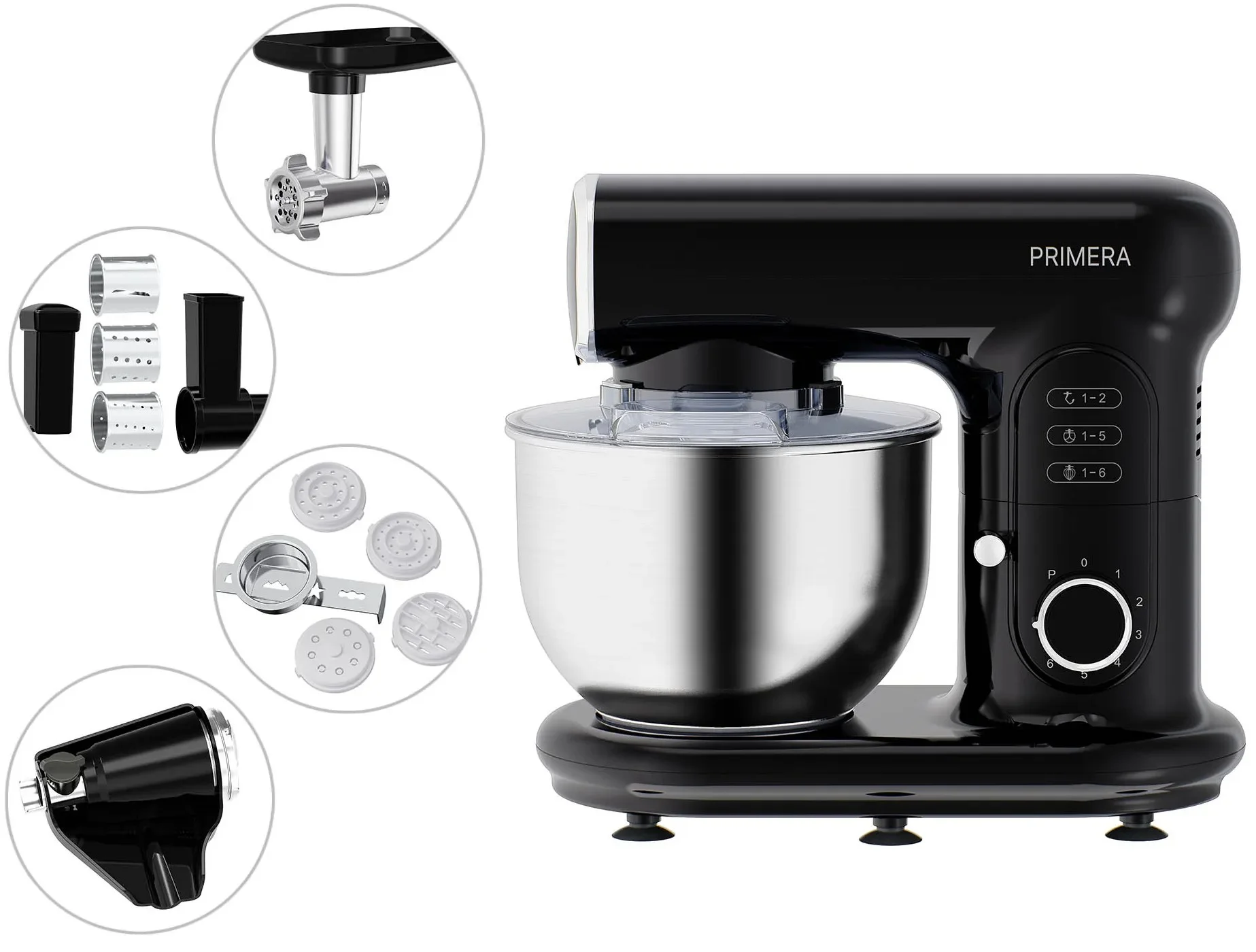 Výkonný kuchyňský robot Primera s 800W motorem a planetárním pohybem nabízí snadné a profesionální pečení, míchání, hnětení i šlehání. Velká nerezová nádoba o objemu 4,8 litru umožňuje pracovat s větším množstvím surovin, zatímco bohatá sada příslušenství pokryje všechny vaše potřeby – od mletí masa, přes strouhání a krájení, až po odšťavňování rajčat nebo výrobu těstovin a sušenek.