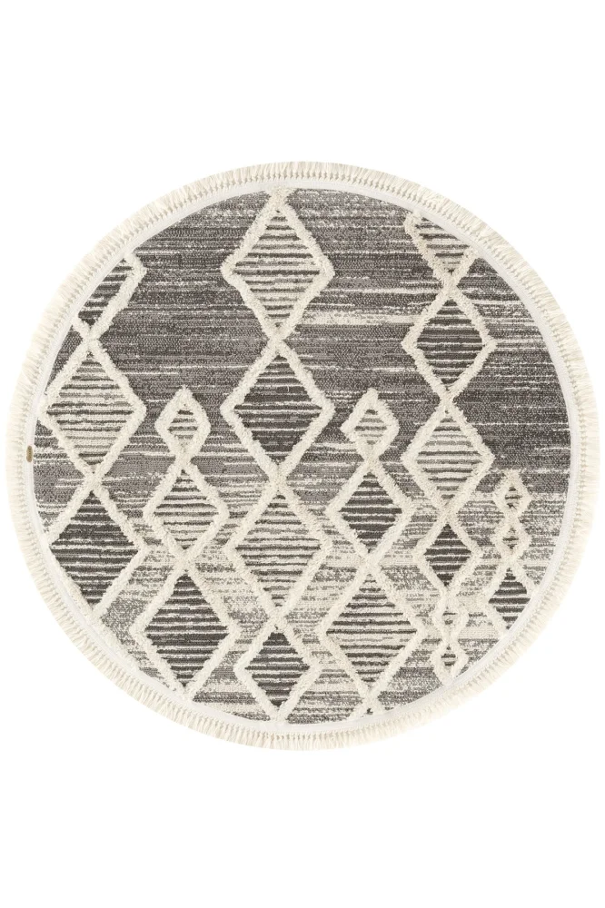 Kulatý koberec o průměru 100 cm je vyroben z 100% polyesteru a vnáší do prostoru jemný šedý odstín s elegantními třásněmi, které dodají interiéru stylový detail. Výška hromady činí 11 mm, takže můžete po jejím povrchu pohodlně kráčet, zatímco spodní bavlněná strana zajišťuje pevnost a dlouhodobou kvalitu.