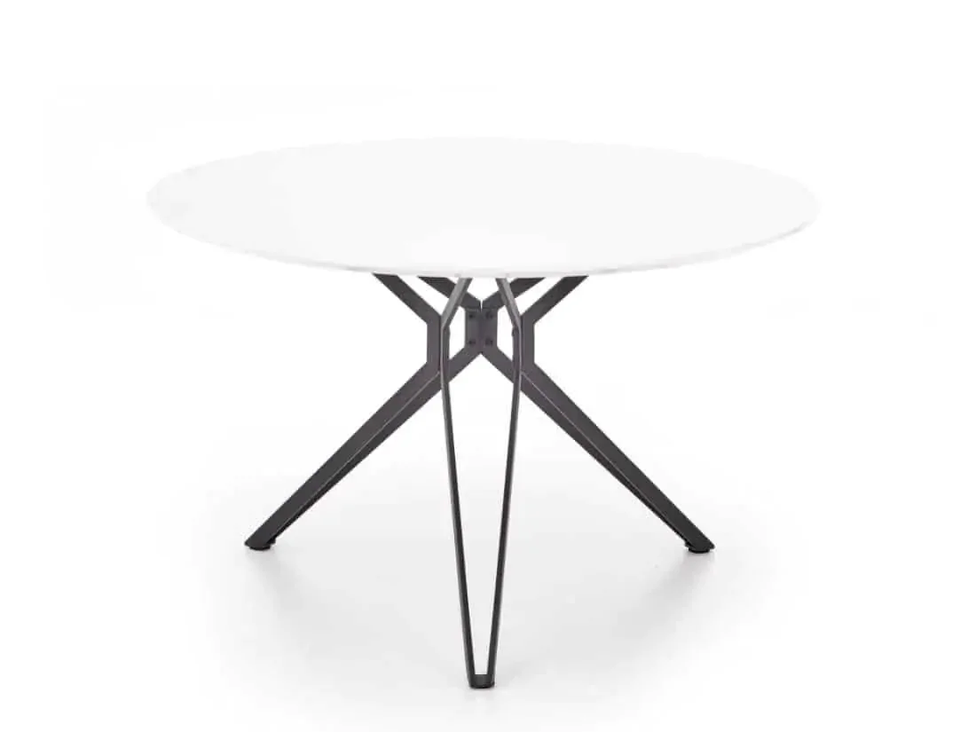 Kulatý jídelní stůl kombinuje bíle lakovanou desku z MDF s černou podnoží z práškované oceli. Neobvyklý tvar nohou slouží zároveň jako výrazný designový prvek, který stůl okamžitě zaujme. Své uplatnění najde v různých interiérech - v domácnostech, kuchyních, jídelnách i kancelářích. Dodává se samostatně a v demontovaném stavu. Pro dokonalé sladění doporučujeme doplnit stůl některými z našich jídelních židlí, například modelem K199, nebo dalšími z naší široké nabídky židlí. Povrch je odolný a snadno se čistí, takže stůl zůstane dlouho jako nový.