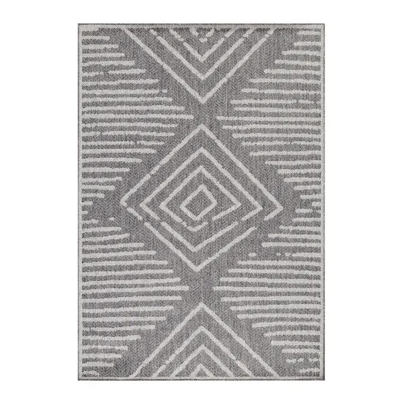 Šedý kusový koberec Aruba 4902 nabízí výrazný geometrický vzor s centrálním kosočtvercem a pruhy podél delších stran. Tento motiv se skvěle hodí do chodby, kuchyně i jídelny a stejně dobře doplní i venkovní prostor na terase.