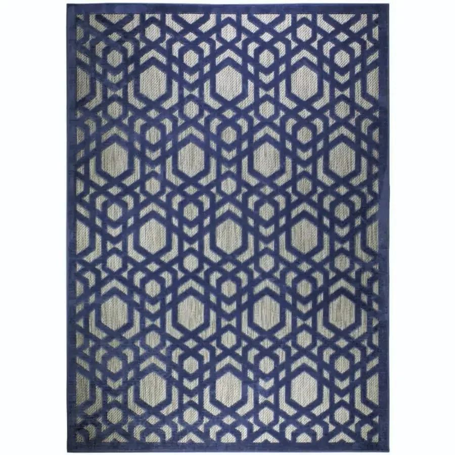 Modrý kusový koberec s výrazným geometrickým motivem se hodí do jakékoliv místnosti a stejně tak ozvlášní venkovní prostor či terasu. Je vyroben z odolného polypropylenu, který zajišťuje dlouhou životnost a snazší údržbu.