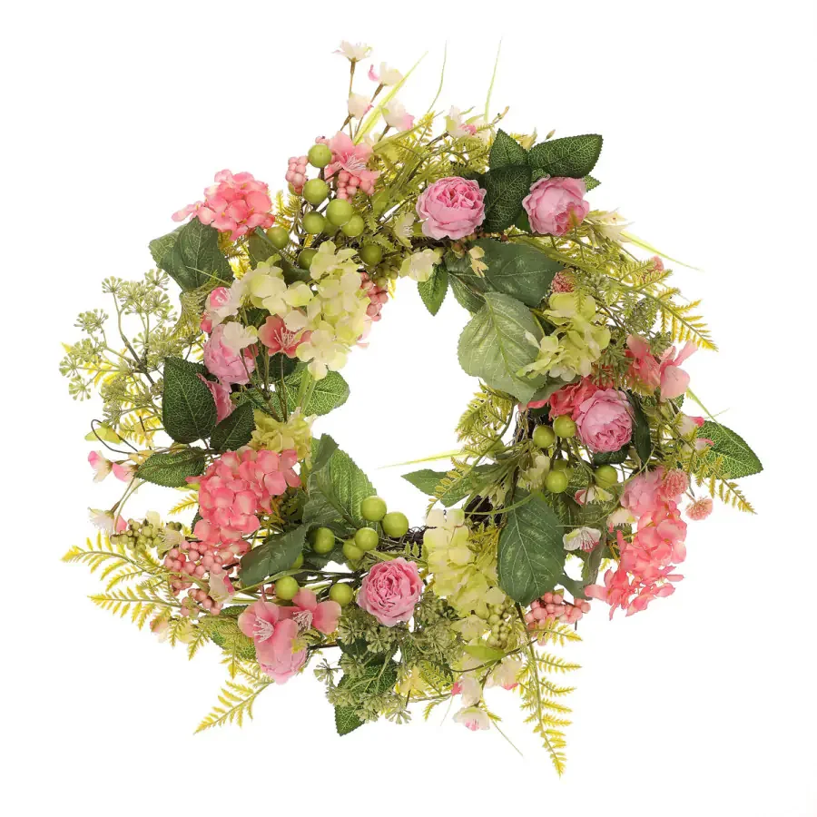 Růžovo-zelený věnec PRZ4100-L o průměru 55 cm kombinuje umělé květiny, bobule a kapradí, čímž vznikají svěží a výrazné barevné tóny. Jeho materiál umožňuje realistický vzhled bez nutnosti zvláštní péče, tedy se jedná o bezúdržbovou dekoraci. Věnec je vhodný pro výzdobu interiéru i venkovních prostor po celý rok a dodá domovu příjemnou atmosféru. Můžete ho umístit na dveře, zeď nebo nad stůl a snadno jej sladit s ostatními doplňky.