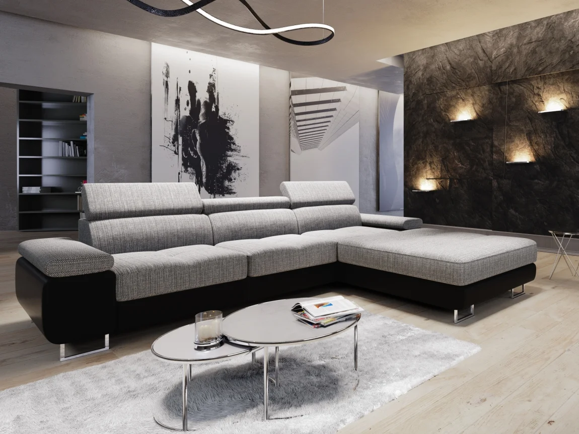 Rohová sedačka LAING MINI s pravou orientací nabízí pohodlné sezení a prostorné spaní pro hosty. Potahová látka Kornet 02 v šedé barvě s jemným prošíváním bílou a černou nití a doplněná černou ekokůží Dolaro 8 tvoří stylový a odolný kombinovaný povrch. Součástí jsou tři regulovatelné záhlavníky, rozklad s výsuvnou matrací delfín a praktický úložný prostor v otomanu. Sedák je prošívaný a celé čalounění je zhotoveno tak, aby působilo jednotně a poskytovalo komfortní posezení i stabilní oporu. Celkové rozměry: šířka 273 cm, výška 94 cm, hloubka 68–88 cm (dle polohy záhlavníku); ložná plocha 211 × 125 cm; výška sedu 38 cm; hloubka sedu 58/158 cm (po zádové opěrce); šířka otomanu 103 cm; šířka/výška záhlavníků 70/28 cm. Sedačka je dodávána v demontu.