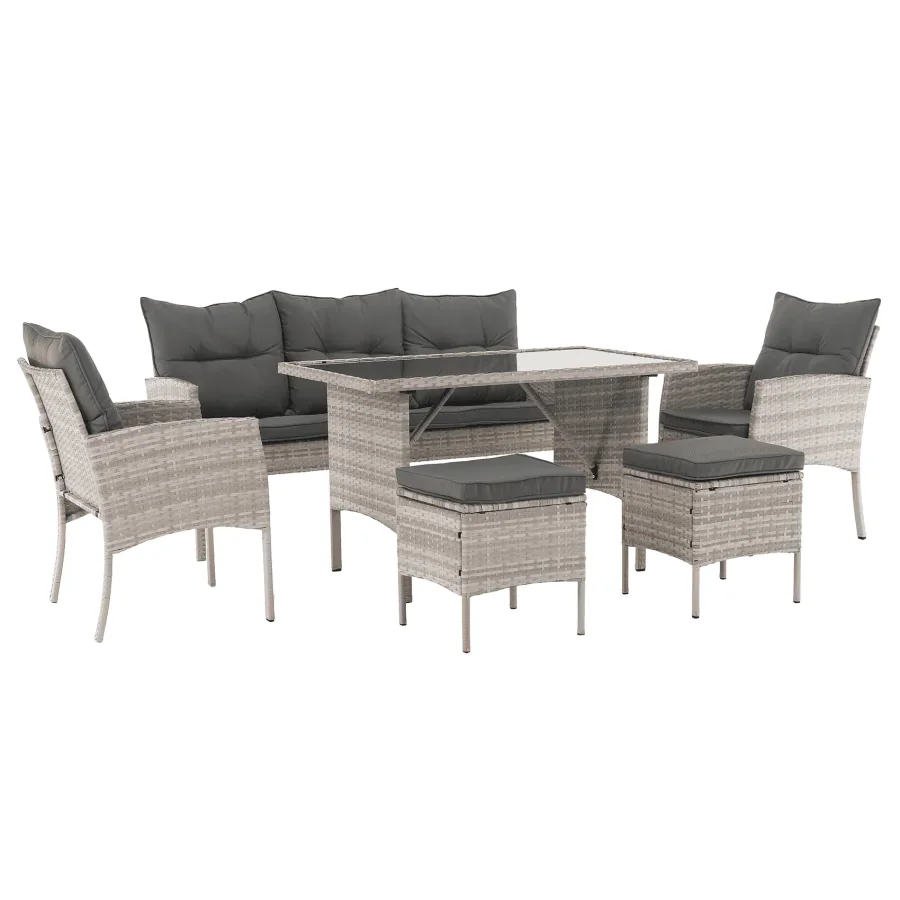 Šestidílný zahradní set LALEN je ideálním společníkem pro letní dny na terase či zahradě, vyrobený z technoratanu ve světlé šedé barvě. Robustní kovová konstrukce zajišťuje stabilitu i při venkovním použití.