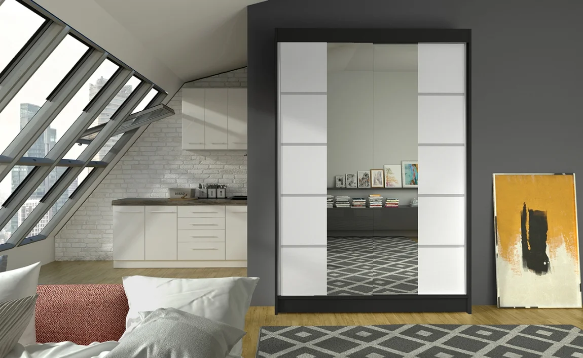 Šatní skříň se zrcadlem v elegantním provedení černá/bílá přináší moderní vzhled i praktičnost. Rozměry 120 x 58 x 200 cm (š x v x h) potvrzují dostatek místa pro šaty i doplňky a konstrukce jde o laminovanou desku tloušťky 16 mm s ABS hranami pro dlouhou životnost.