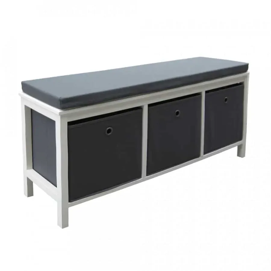 Praktická a lehká lavice s 3 látkovými šuplíky pro snadnou organizaci drobných věcí v předsíni či ložnici. Konstrukce kombinuje MDF a masiv s bílým provedením pro čistý a moderní vzhled. Šuplíky jsou potaženy šedou bavlněnou látkou (100% bavlna) a nabízejí samostatné úložné prostory o rozměrech 30 x 28 x 29 cm. Rozměry lavice činí 103 x 30 x 49 cm a nosnost celé lavice dosahuje 100 kg, přičemž každý šuplík unese 5 kg. Dodáváno v demontu, montáž je rychlá a snadná.