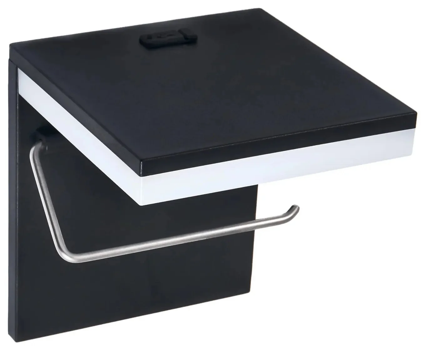 Moderní držák na toaletní papír, který kombinuje praktické použití s komfortním osvětlením a nabíjecí funkcí. Tento kovovo-plastový doplněk v elegantní černé barvě je vybaven integrovaným USB portem, díky němuž snadno připojíte svůj telefon nebo jiné zařízení.
