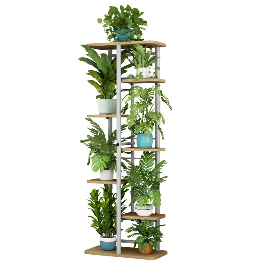 Stojan má celkem sedm polic, z nichž každá unese až 2 kg, což usnadňuje rovnoměrné rozmístění různých druhů květin. Rozměry stojanu činí 36 x 23,5 x 120 cm, vrchní police má šířku 30 cm a výškové rozestupy mezi policemi jsou navrženy pro pohodlný přístup. Dodáváno v demontu a k montáži stačí postup podle návodu. Díky víceúčelovému designu a kombinaci bílé barvy s dřevěným dekorem působí stojan elegantně v různých typech interiérů a šetří místo na podlaze. Pro dlouhodobou stabilitu doporučujeme rovnoměrné zatížení jednotlivých polic.