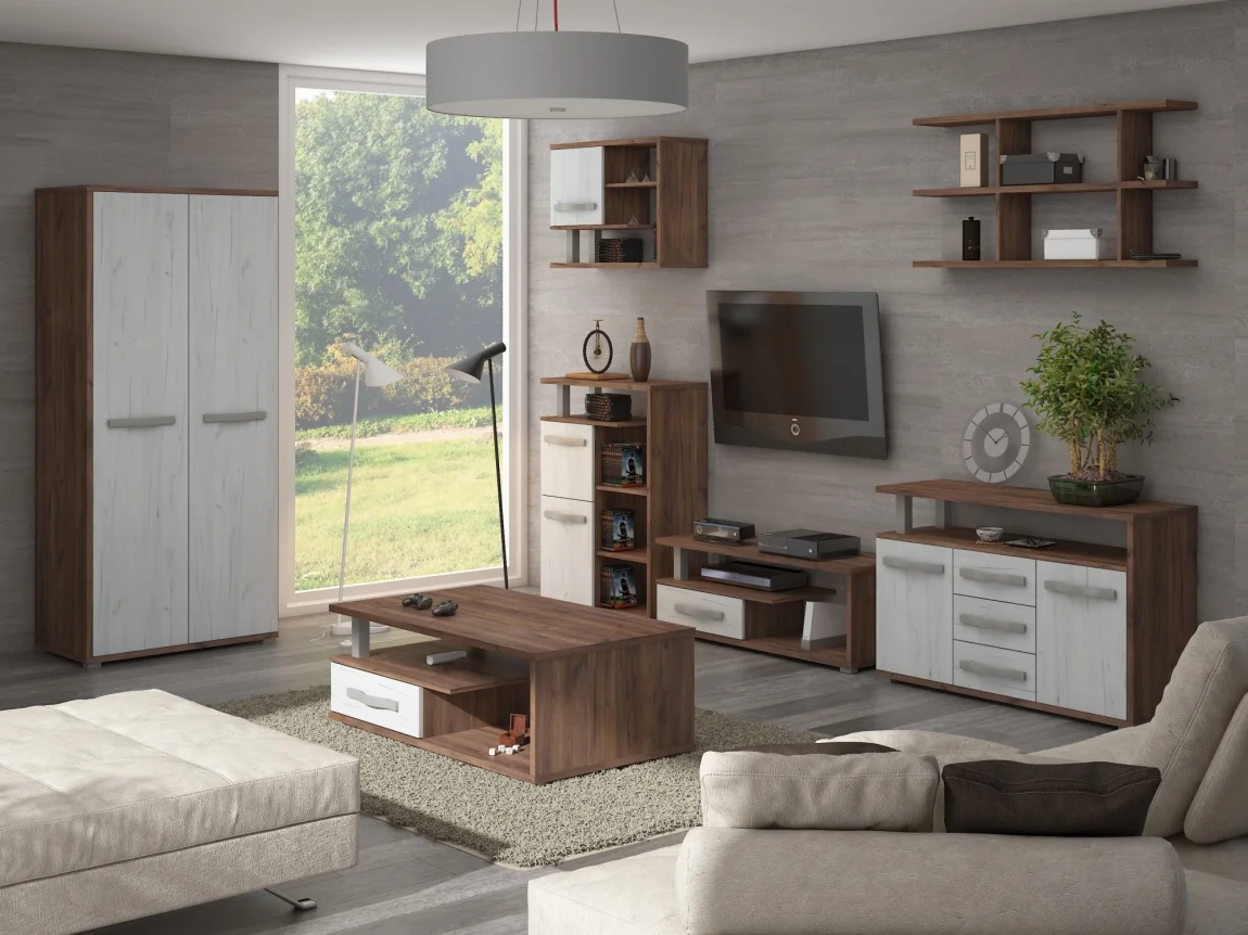 Ilustrační sestava obývacího pokoje ukazuje, jak lze jednotlivé segmenty poskládat do pohodlného a stylového prostoru. Modulární systém umožňuje vybrat si a koupit každý díl zvlášť, a tak si snadno vytvoříte řešení na míru. Předložený výčet zahrnuje komodu, konferenční stolek, police, vysoký regál, TV stolek, skříň a závěsnou skříňku a uvádí orientační rozměry jednotlivých položek: komoda 120 × 77 × 43 cm; konferenční stolek 118 × 43 × 74 cm; police 118–142 × 60 × 20 cm; vysoký regál 80 × 114 × 39 cm; TV stolek 118 × 43 × 43 cm; skříň 90 × 198 × 53 cm; závěsná skříňka 80 × 60 × 33 cm. Barva kombinuje teplé tóny craft tobaco a craft bílý, materiál je LTD tloušťky 16 mm. Dodáváno v demontu a se zárukou 5 let.