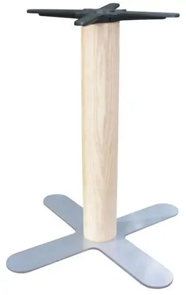 Centrální litinová podnož pro jídelní stoly s čtyřramennou základnou a kulatou dřevěnou trubkou. Je koncipována pro interiéry se zvýšenou zátěží, ideální pro restaurace, jídelny, kavárny a bary.