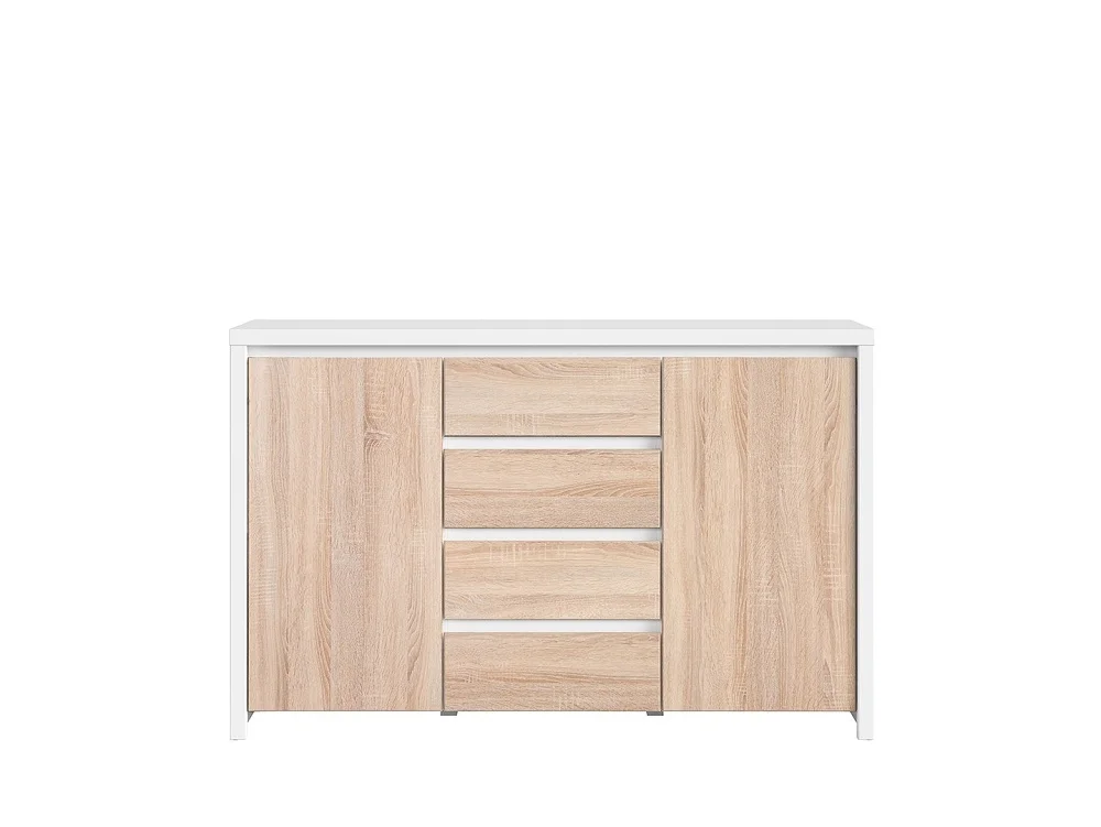 Kombinovaná komoda z LTD materiálu v kombinaci bílé a dub sonoma nabízí praktický úložný systém se 4 zásuvkami a 2 bočními skříňkami, uvnitř kterých najdete police pro lepší členění.